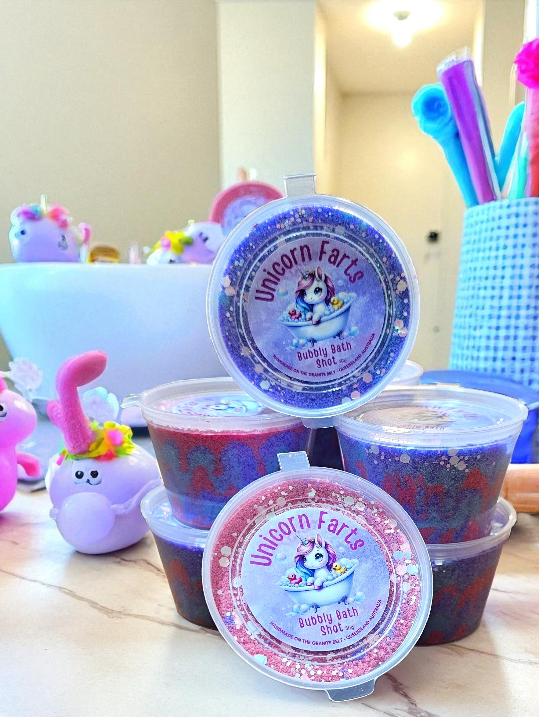 Add a few scoops of this Unicorn Fart powder to your bath and watch the magic happen. Enriched with cocoa butter, this is a must for any unicorn lover! Use as much or as little as you like